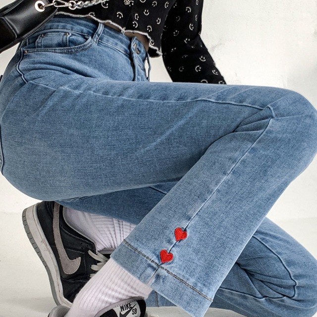 M~4XL ハートパッチ ワイドストレート デニムパンツ