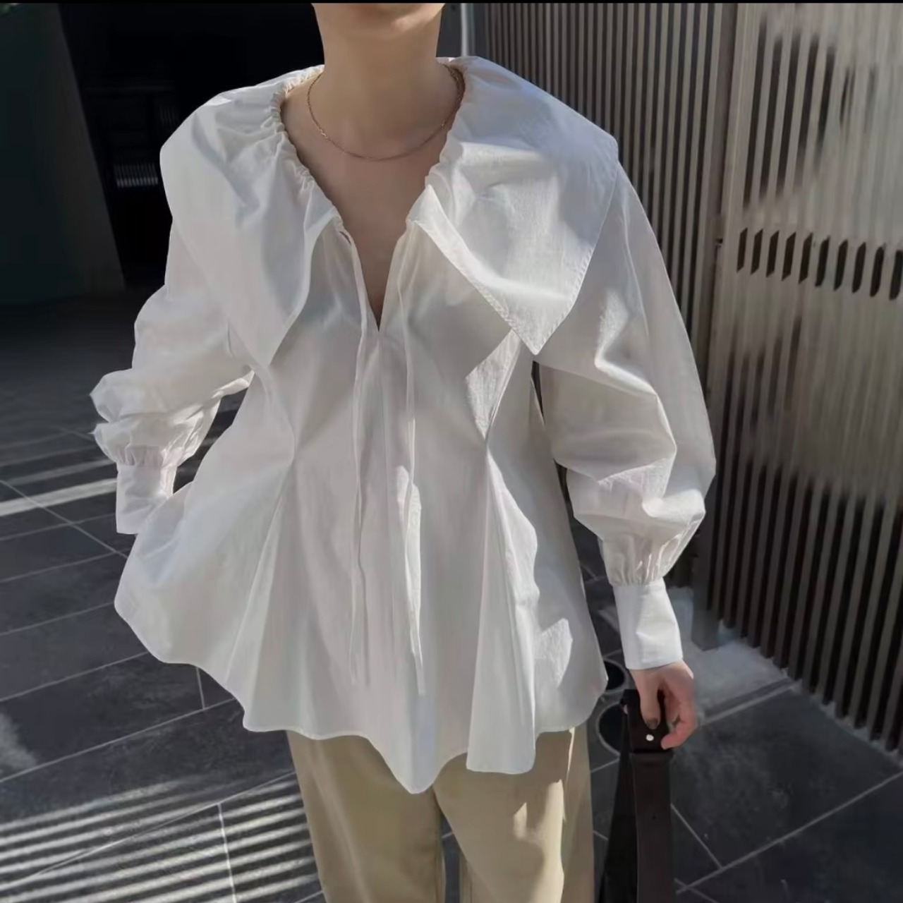 シンプルなデザインなので、アクセサリーや小物で個性を演出