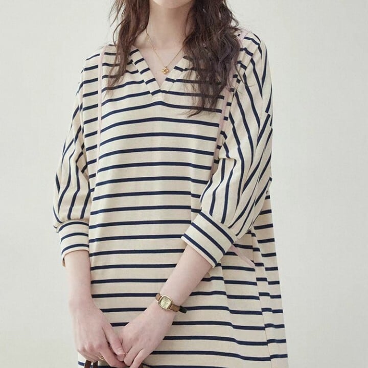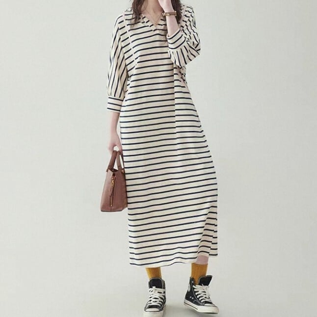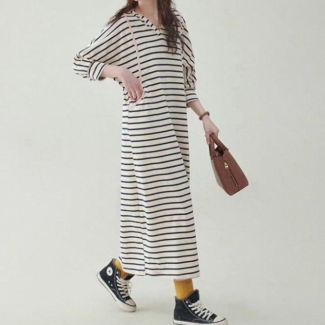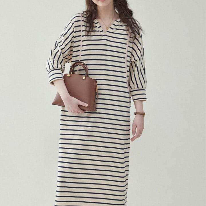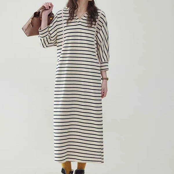 ボーダーシャツカラー マキシ丈 ワンピース L1096
