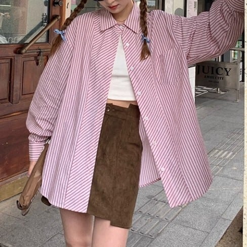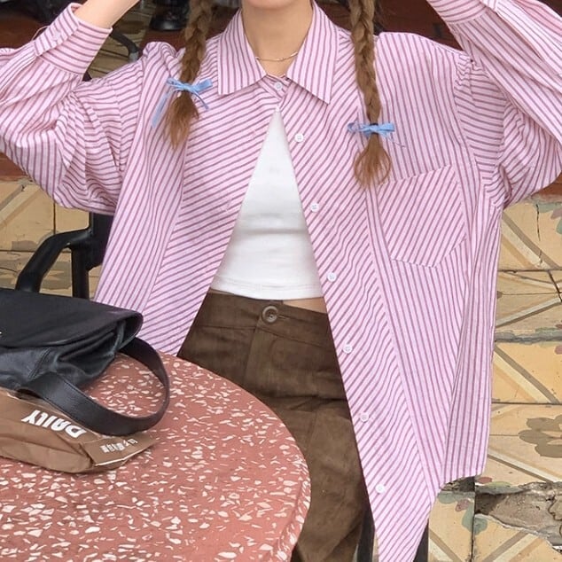 ストライプ柄が目を引くヒップ丈シャツ