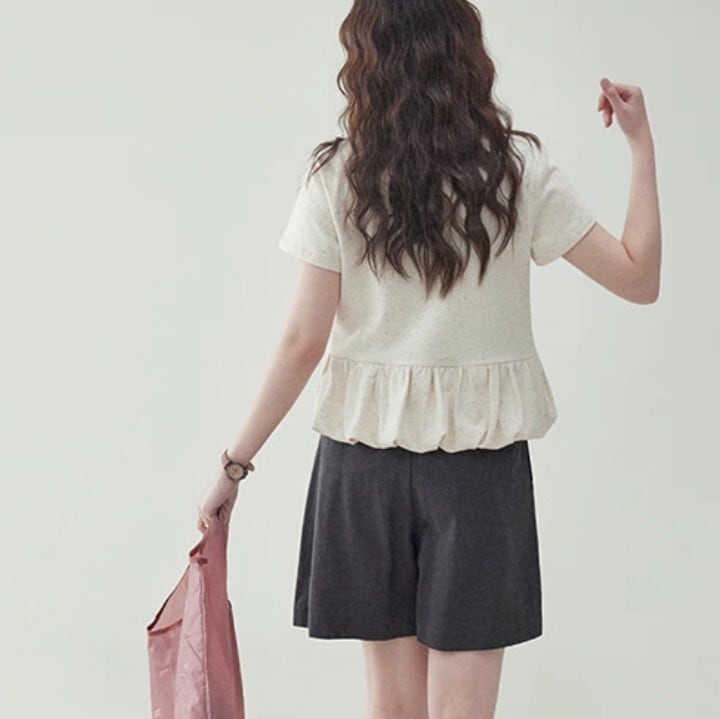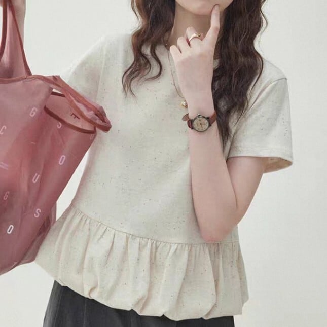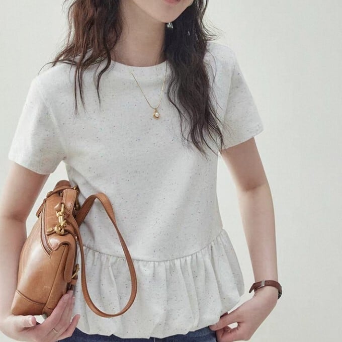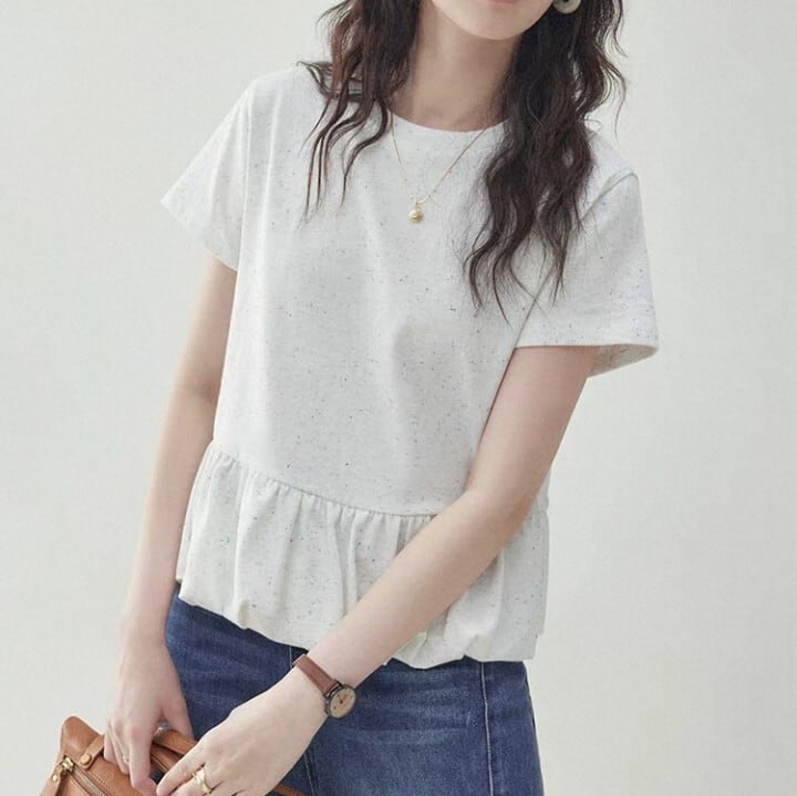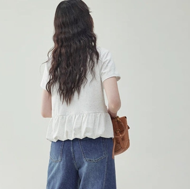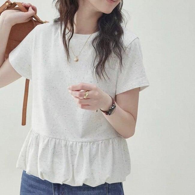カジュアルながらも、裾のペプラムデザインがフェミニンな印象を与えます。