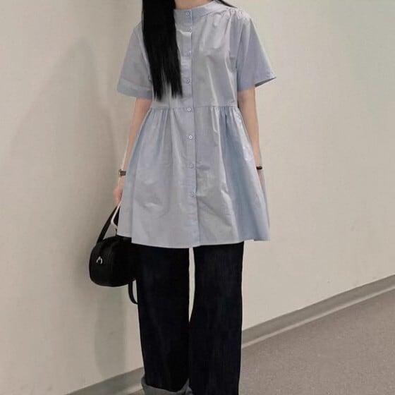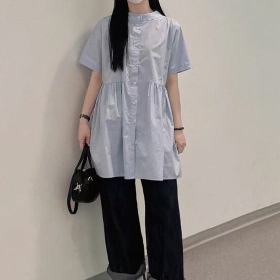 シャツカラーがきちんと感を演出し、カジュアルだけでなく、ちょっとしたお出かけにもぴったり。